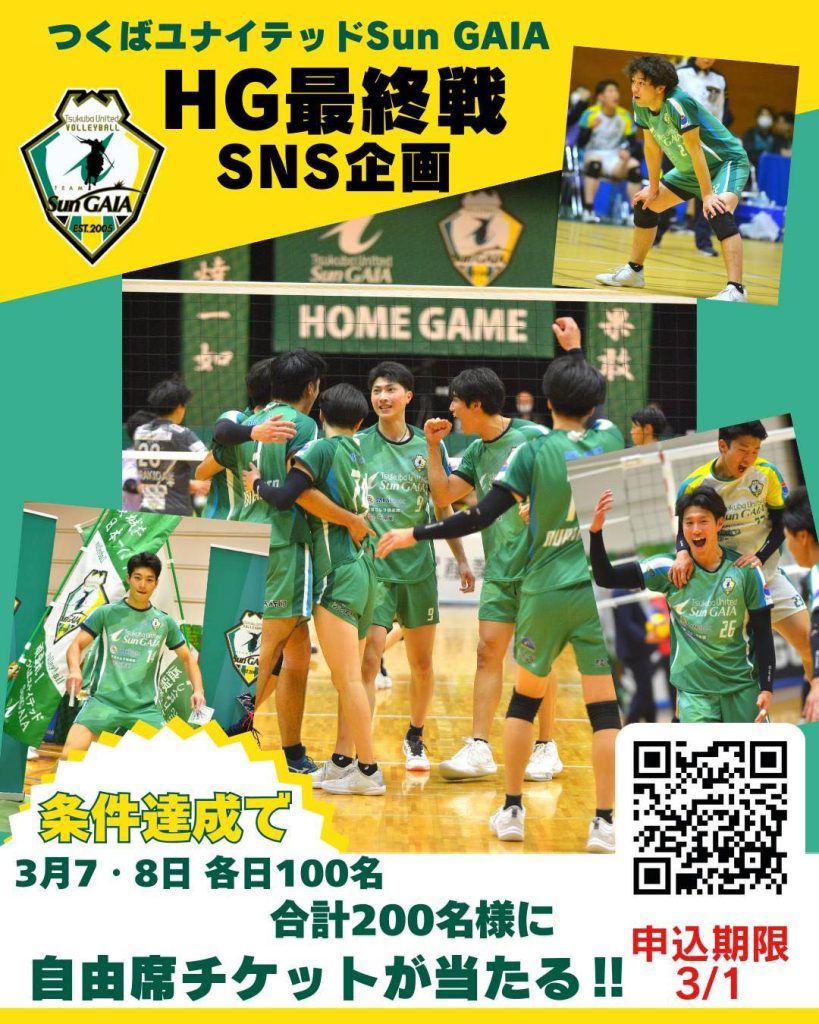 今シーズンラストホームゲーム特別企画として3月7日(土)8日(日)開催の「V.LEAGUE MEN EASTつくばユナイテッドSun GAIAホームゲーム牛久大会」に両日100名合計200名様をご招待いたします。